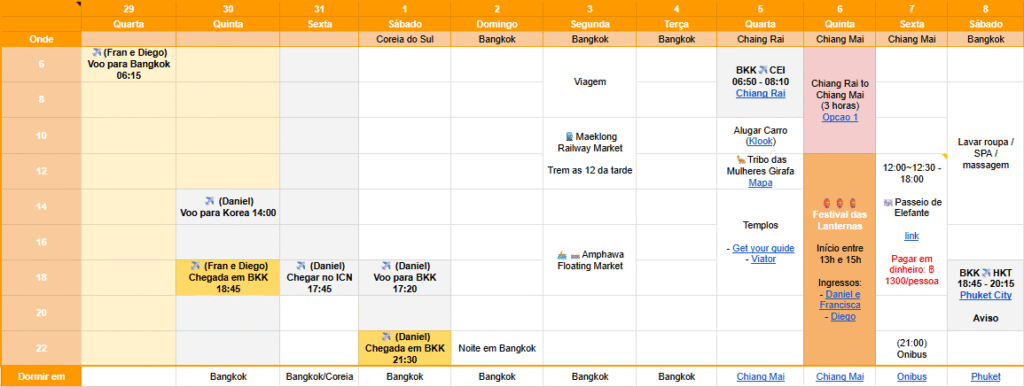 The journey lasted a total of 32 days, starting from the time I departed Canada until I returned. Everything was organized in a Google Sheets spreadsheet. Most of the information is in Portuguese so that my family, who do not speak English, could comprehend it. My mom and brother traveled from Brasília, Brazil, while I arrived from Vancouver, Canada.