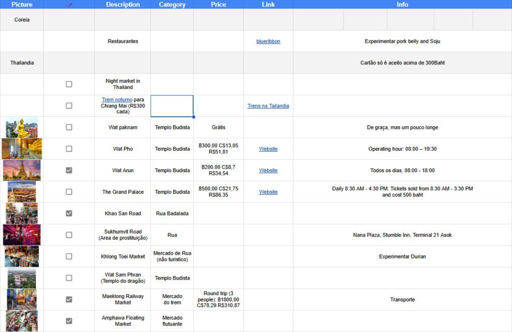 The table has the columns: picture, “check” (if I am going for sure), description, category, price, link, info (extra information); and the rows with the individual place, restaurant or cafe, event, street, market, etc.