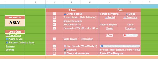Another important area of the spreadsheets is the “to-do / done” area, where I arrange anything that should be done before the trip. The list can vary from getting a haircut, freezing gym membership, suspending phone bill, to getting vaccines, insurance, visas, international licenses, etc. Everything that needs to be done before the trip goes on these two tables: “to-do” and “done“.